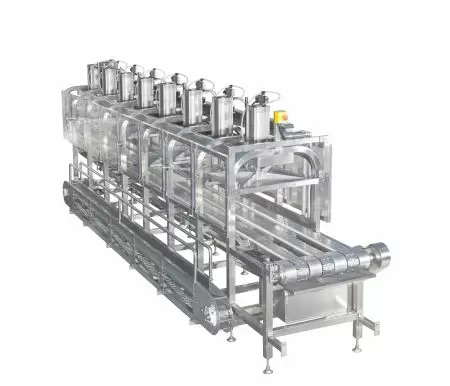 After the tofu molds are stacked and transported to the tofu press station, the conveyor belt of the tofu press is synchronized and the tofu molds are automatically positioned, and when the cylinder pressure is output, the press will be lowered together to press the tofu molds. The press force and time are automatically controlled without manual adjustment.