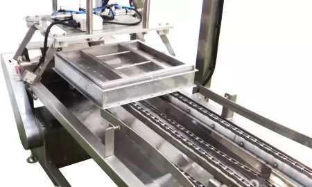 After the tofu molds are stacked and transported to the tofu press station, the conveyor belt...