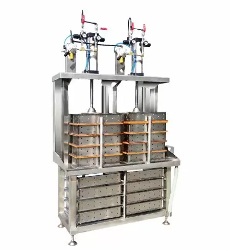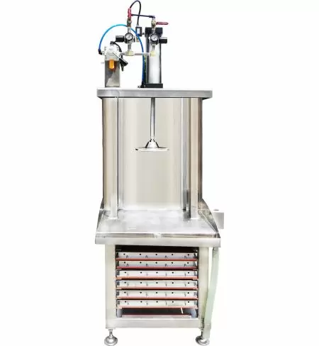 永順利的固定式豆腐压台可堆叠豆腐模具,汽缸压力输出时,压台一起下降压住豆腐模具,施压力量、施压时间皆可人工调整,压水成型,每一叠可放置4-5个豆腐模具,加速豆腐成型。