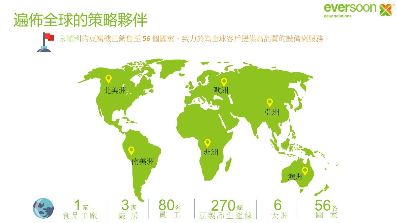 最值得驕傲的是,自2010年起,我們已經在歐洲、亞洲、美洲、大洋洲協助超過50家國際食品、飲料大廠規劃豆腐、豆奶生產線;尤其是許多尚無豆腐、豆奶生產經驗的食品業者,不僅委託我們進行整廠規劃,還針對當地產品的口味調整產線機器參數,使豆腐、豆奶的成品符合當地消費者的需求而快速打入市場。
